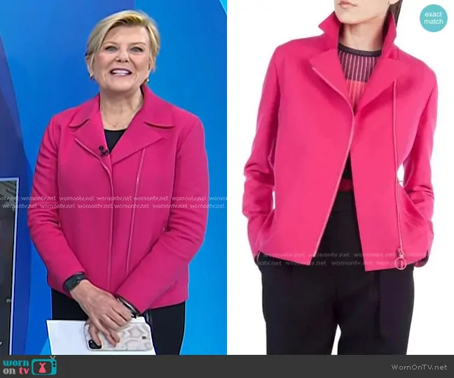 Anne Thompson on Today on NBC was spotted wearing this pink moto jacket on Today on May 21 2025's episode. Anne's Jacket is the Wool-Blend Moto Jacket in Pink by Akris Punto.