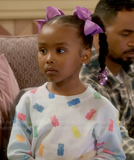 Maya (played by River Blossom) on Poppas House on CBS was spotted wearing this gummy bear sweater on Poppas House on episode 'Wig' (1x08) in Dec 2024. 's Sweater is the Gummy Bears Print Sweater by Truly Me.