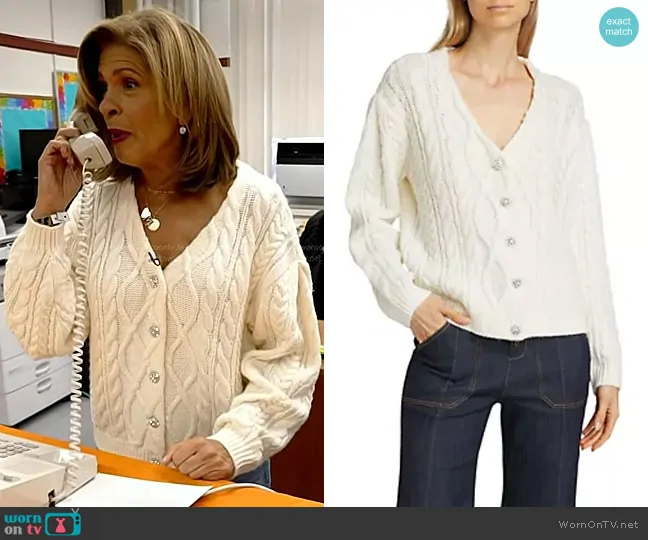 Hoda Kotb on Today on NBC was spotted wearing this white cable knit cardigan on Today on Dec 17 2024's episode. Hoda's Sweater is the Amandine Cardigan Dress by Cinq a Sept .