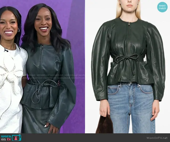 on Today on NBC was spotted wearing this green leather jacket on Today on Dec 17 2024's episode. 's Jacket is the Aidan Jacket in Jasper by Ulla Johnson.
