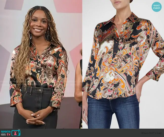 Zuri Hall on Access Hollywood on NBC was spotted wearing this black paisley print blouse on Access Hollywood on Jul 29 2025's episode. Zuri's Top is the Dani Printed Silk Button-Front Shirt by L'Agence.