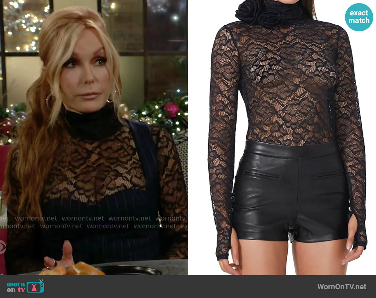 Lauren Fenmore (played by Tracey Bregman) on The Young and the Restless on CBS was spotted wearing this black lace top and pinstripe bustier top on The Young and the Restless on Dec 23 2024's episode. Lauren's Top is the Zadie Lace Mock Neck Top by AFRM . Lauren's Top is the Monet Waistcoat by Retrofete.