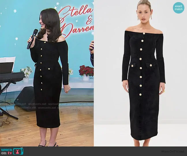 on Today on NBC was spotted wearing this black button front dress on Today on Dec 23 2024's episode. 's Dress is the Off-the-shoulder button-embellished chenille midi dress by Self Portrait.