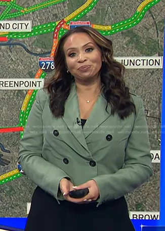 Adelle Caballero on Today on NBC was spotted wearing this green double breasted cropped blazer on Today on Jan 06 2025's episode. Adelle's Jacket is the Virgin Wool & Silk Cropped Blazer in Green by Helmut Lang.
