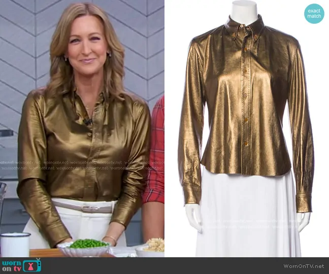 Lara Spencer on Good Morning America on ABC was spotted wearing this metallic leather shirt on Good Morning America on Jan 07 2025's episode. Lara's Top is the Leather Button Down Shirt by Ralph Lauren Purple Label.