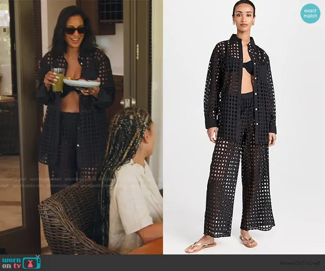 Jessel Taank on The Real Housewives of New York City on Bravo was spotted wearing this black eyelet top and pants on The Real Housewives of New York City on episode 'Dinner Disasters and Breakfast Breakdowns' (15x13) in Jan 2025. Jessel's Top is the The Oxford Tunic by Solid and Striped . Jessel's Pants is the The Delaney Pants by Solid and Striped . Jessel's Sunglasses is the SL 573 Havana And Silver by Saint Laurent.