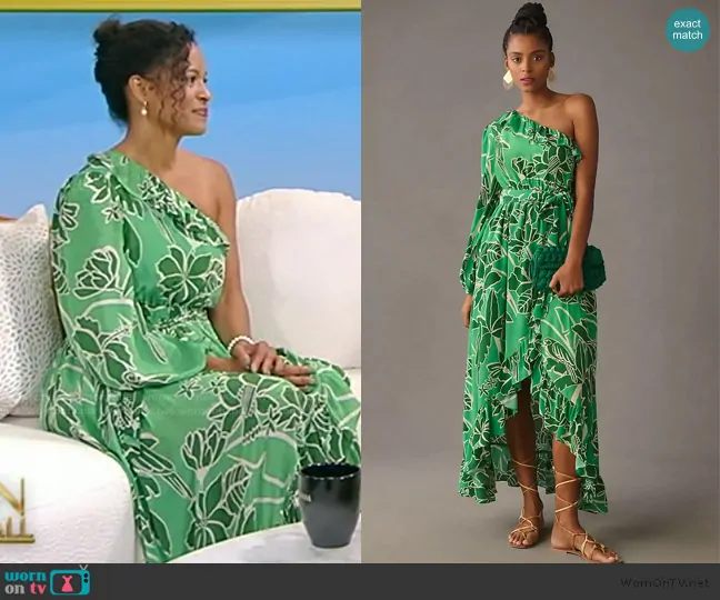 on Tamron Hall Show on ABC was spotted wearing this green floral one shoulder dress on Tamron Hall Show on Jan 09 2025's episode. 's Dress is the Printed One-Shoulder Ruffle Dress by Farm Rio x Anthropologie.