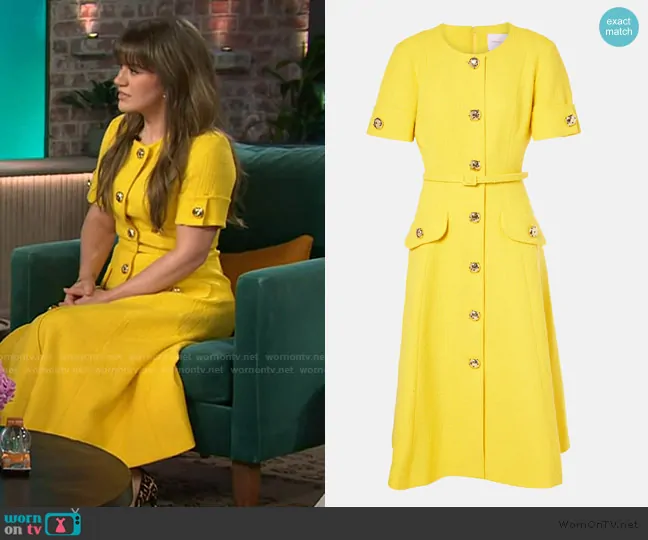 Kelly Clarkson on The Kelly Clarkson Show on NBC was spotted wearing this yellow tweed button front dress on The Kelly Clarkson Show on Jan 09 2025's episode. Kelly's Dress is the Tweed Midi Dress by Carolina Herrera.