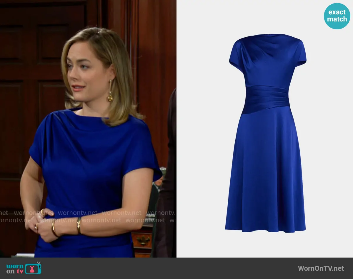 Hope Logan (played by Annika Noelle) on The Bold and the Beautiful on CBS was spotted wearing this blue draped dress on The Bold and the Beautiful on Jan 10 2025's episode. Hope's Dress is the Pleated Hammered Satin Midi Dress by Rickie Freeman for Teri Jon .