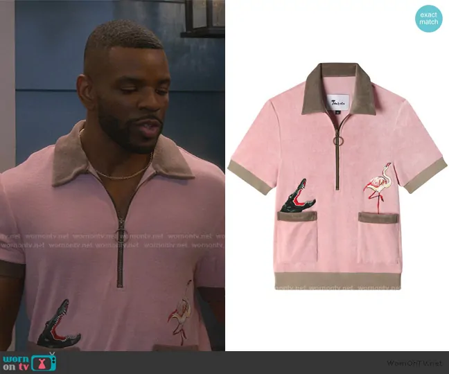 Bernard (played by Jermelle Simon) on The Upshaws on Netflix was spotted wearing this pink terry polo with embroidery on The Upshaws on episode 'Grifter Grifter' (6x05) in Jan 2025. 's Shirt is the Flamingo Tartare Cabana Shirt by Tombolo.