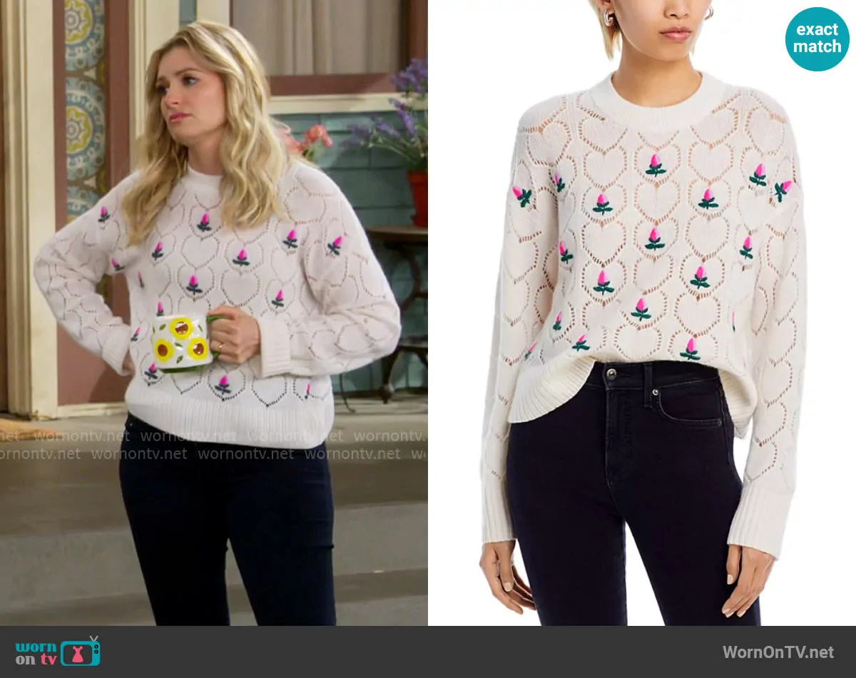 Gemma (played by Beth Behrs) on The Neighborhood on CBS was spotted wearing this white floral embroidered sweater on The Neighborhood on episode 'Welcome to Pickleball' (7x09) in Jan 2025. Gemma's Sweater is the Pointelle Embroidered Crewneck Sweater by Aqua.