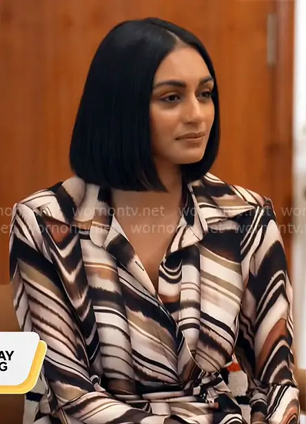 Shanelle Kaul on CBS Mornings on CBS was spotted wearing this brown marble print wrap top and pants set on CBS Mornings on Dec 06 2025's episode. Shanelle's Top is the Long Printed Shirt by Zara . Shanelle's Pants is the High Waisted Marble Printed Flare Pants by Zara .