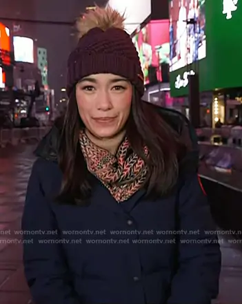 Emilie Ikeda on Today on NBC was spotted wearing this Emilie’s navy down coat and purple knit beanie on Today on Dec 29 2025's episode. Emilie's Coat is the Shelburne Paneled Parka Coat by Canada Goose . Emilie's Hat is the Lexington Beanie by Sweet Turns.