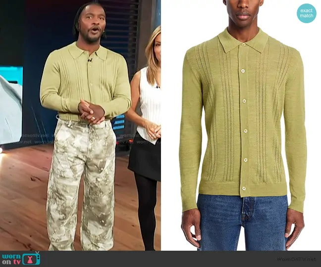 Scott Evans on Access Hollywood on NBC was spotted wearing this green knit sweater and camo print pants on Access Hollywood on Jan 20 2025's episode. Scott's Sweater is the Thor Long Sleeve Cardigan by NN07 . Scott's Pants is the Abstract Print Carpenter Pants by Zara.