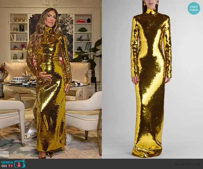 Erin Lichy on The Real Housewives of New York City on Bravo was spotted wearing this gold sequin reunion dress on The Real Housewives of New York City on episode 'Reunion' (15x16) in Jan 2025. Erin's Dress is the Sequin Long Sleeve Knit Gown by Bottega Veneta . Erin's Shoes is the Cindy Slingback by Retrofete.