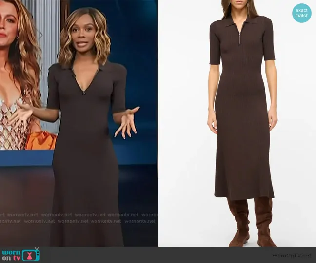 Zuri Hall on Access Hollywood on NBC was spotted wearing this brown polo knit dress on Access Hollywood on Jan 28 2025's episode. Zuri's Dress is the Roland Short-Sleeve Rib-Knit Midi Dress by Staud.