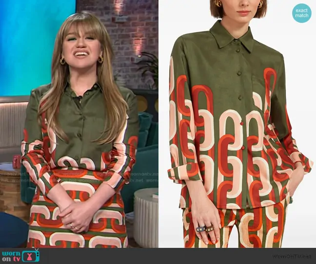 Kelly Clarkson on The Kelly Clarkson Show on NBC was spotted wearing this geometric print blouse and skirt on The Kelly Clarkson Show on Jan 24 2025's episode. Kelly's Top is the Silk geometric print shirt by LA DoubleJ . Kelly's Skirt is the Prometheus-print A-line skirt by LA DoubleJ.