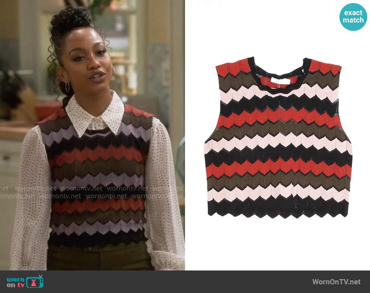 Nina (played by Tetona Jackson) on Poppas House on CBS was spotted wearing this chevron striped knit top on Poppas House on episode 'Puppy' (1x09) in Jan 2025. Nina's Vest is the Leo Top in Army/Primrose/Black by A.L.C..