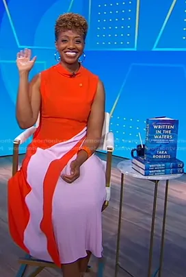on Good Morning America on ABC was spotted wearing this red colorblock midi dress on Good Morning America on Jan 28 2025's episode. 's Dress is the Fluid Tailored Color Block High Neck Pleated Midi Dress in Pink by Karen Millen.
