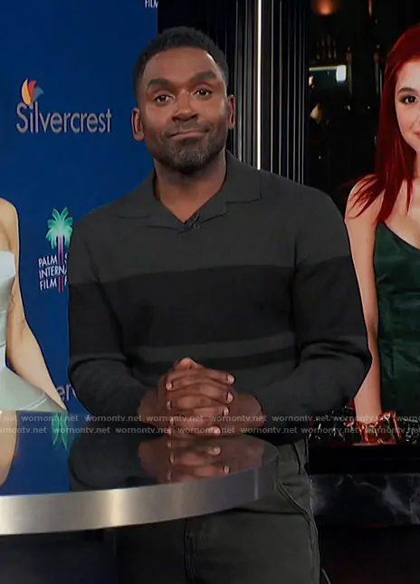 Justin Sylvester on E! News on E! was spotted wearing this gray stripe sweater on E! News on Jan 29 2025's episode. Justin's Sweater is the Striped Double-Faced Knitted Polo Shirt by Cos.