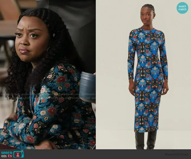 Janine Teagues (played by Quinta Brunson) on Abbott Elementary on ABC was spotted wearing this blue floral print mesh dress on Abbott Elementary on episode 'Girard Creek' (4x12) in Jan 2025. Janine's Dress is the blue arabesque floral jersey lenzing Midi Dress by Farm Rio.
