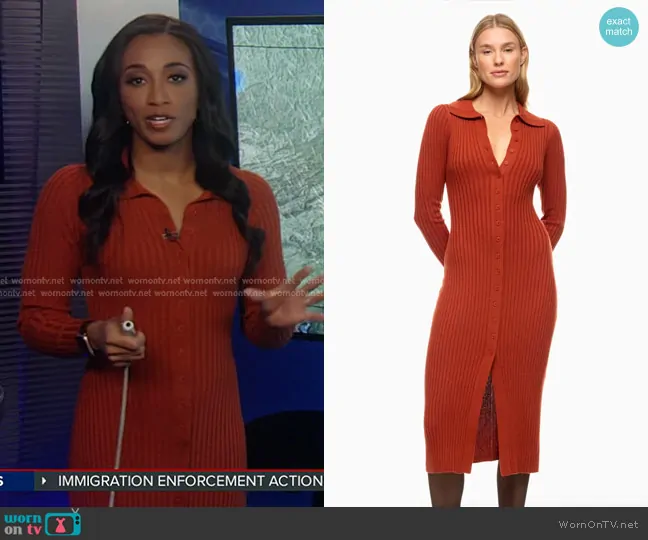 Brittany Bell on Good Morning America on ABC was spotted wearing this orange ribbed cardigan dress on Good Morning America on Jan 30 2025's episode. Brittany's Dress is the Ribbed Cardigan Midi Dress by Thakoon Collective.