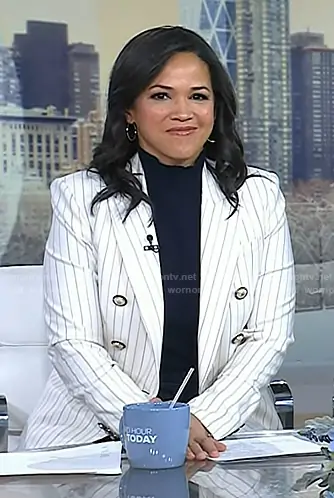 Laura Jarrett on Today on NBC was spotted wearing this white pinstripe blazer on Today on Feb 06 2026's episode. Laura's Jacket is the Miller Stripe Wool Blend Dickey Jacket by Veronica Beard . Laura's Pants is the Renzo Ankle Crop Pants in Navy by Veronica Beard.