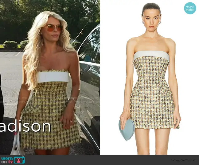 Madison LeCroy on Southern Charm on Bravo TV was spotted wearing this yellow tweed mini dress on Southern Charm on episode 'Red Flags' (10x08) in Jan 2025. Madison's Dress is the Hailey Dress by Marianna Senchina . Madison's Bag is the Studio Box Mini Leather Top-Handle Bag by Ferragamo . Madison's Sunglasses is the High Roller Polarized Sunglasses by Quay.