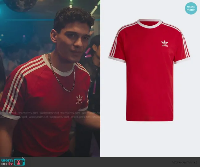 Quincy Shabazian (played by Anthony Keyvan) on XO Kitty on netflix was spotted wearing this red Adidas tee on XO Kitty on episode 'Never Been Kissed' (2x02) in Jan 2025. Q's Shirt is the Adicolor three stripe t-shirt in red by Adidas.