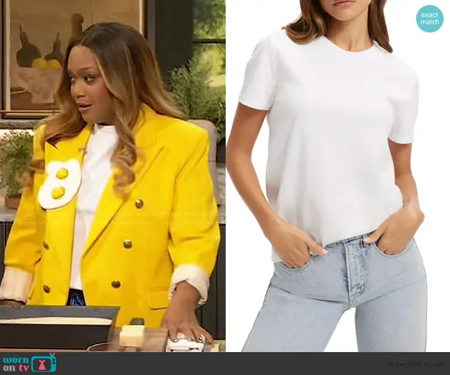 on The Drew Barrymore Show on CBS was spotted wearing this yellow blazer and white tee on The Drew Barrymore Show on Feb 03 2025's episode. 's Top is the Heritage Crewneck Cotton T-Shirt by Good American . 's Blazer is the Double Breasted Blazer Yellow Honeycomb by Banana Republic . 's Brooch is the White Maxi Eggs Brooch by Moschino.
