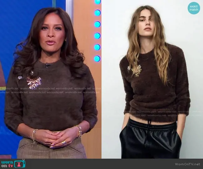 Rocsi Diaz on Good Morning America on ABC was spotted wearing this brown embellished sweater and beige pants on Good Morning America on Feb 04 2025's episode. Rocsi's Sweater is the Faux Fur Knit Sweater with Brooches by Zara . Rocsi's Pants is the Owens Tweed Slim-Fit Trousers by Ralph Lauren Collection.