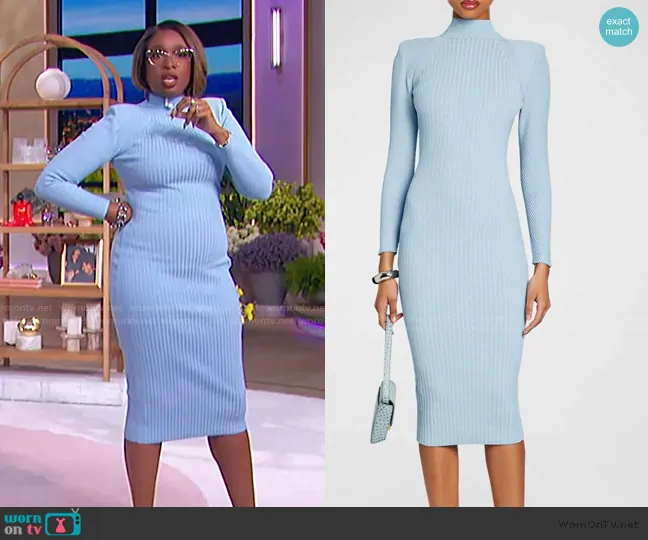 Jennifer Hudson on The Jennifer Hudson Show on FOX was spotted wearing this blue ribbed dress on The Jennifer Hudson Show on Jan 28 2025's episode. Jennifer's Dress is the Aylin Padded-Shoulder Ribbed Midi Bodycon Dress by Retrofete.