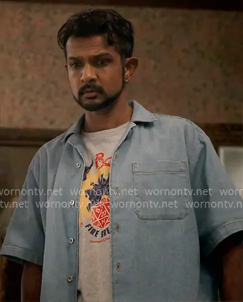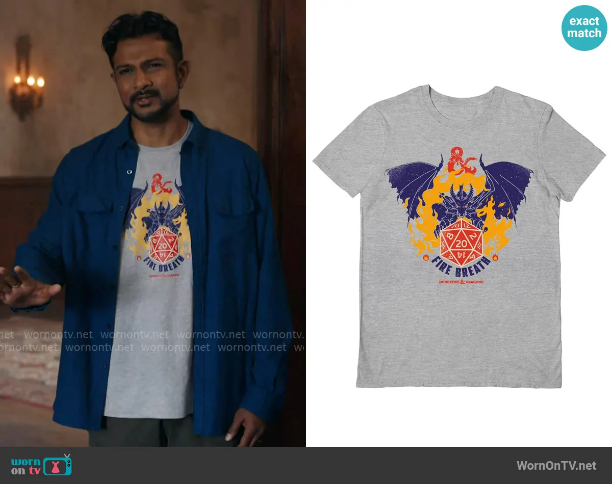 Jay (played by Utkarsh Ambudkar) on Ghosts on CBS was spotted wearing this Dungeon & Dragons t-shirt on Ghosts on episode 'Soul Custody' (5x01) in Oct 2025. Jay's Shirt is the Fire Breath Grey T-Shirt by Dungeons & Dragons.
