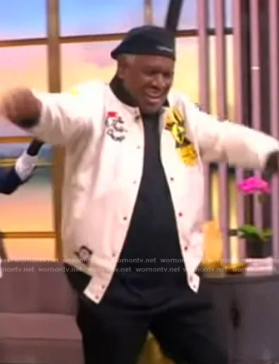 on The View on ABC was spotted wearing this white embroidered jacket on The View on Feb 07 2025's episode. 's Jacket is the Rumble In The Jungle '74 Stadium Jacket by Roots of Fight.