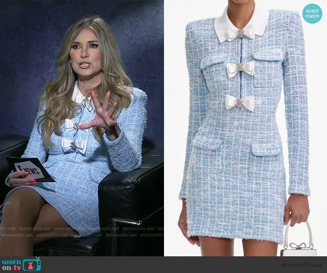 Nikki Novak on E! News on E! was spotted wearing this blue tweed bow detail dress on E! News on Feb 07 2025's episode. Nikki's Dress is the Blue Check Collared Knit Mini Dress by Self Portrait.