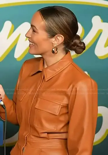 Emily Orozco on Access Hollywood on NBC was spotted wearing this brown leather shirtdress on Access Hollywood on Jan 21 2026's episode. Emily's Dress is the Front Slit Leather Shirt Dress by Marissa Webb Collective.