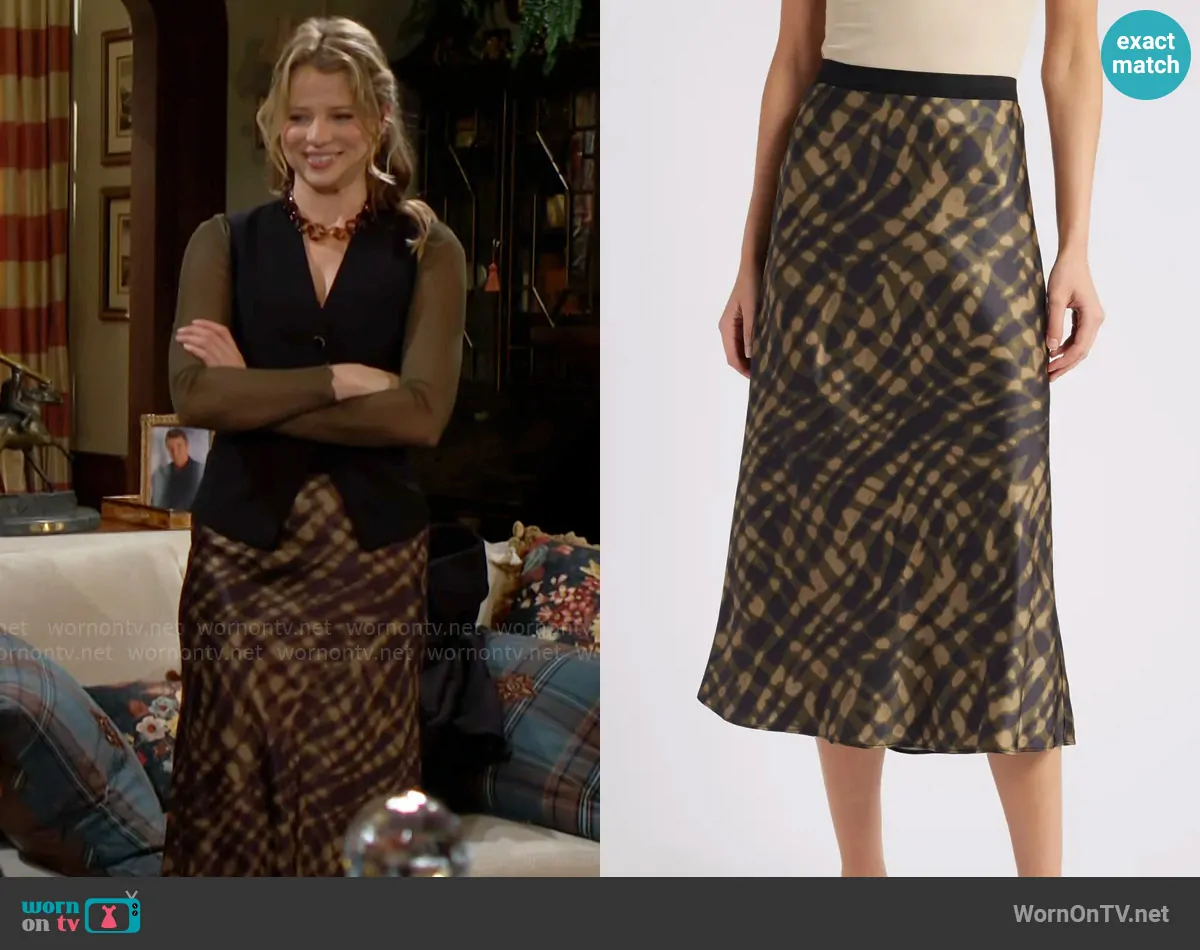 Summer Newman (played by Allison Lanier) on The Young and the Restless on CBS was spotted wearing this olive green mesh tie dye skirt on The Young and the Restless on Feb 10 2025's episode. Summer's Skirt is the Berlin Skirt in Cypress by Rails.