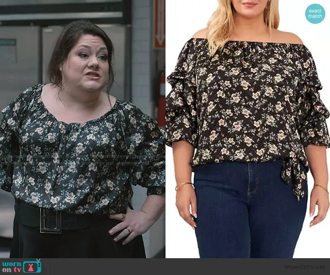Dana Sue Sullivan (played by Brooke Elliott) on Sweet Magnolias on Netflix was spotted wearing this floral print top on Sweet Magnolias on episode 'True North' (4x05) in Feb 2025. Dana's Top is the Off the Shoulder Blouson Sleeve Top by Vince Camuto.