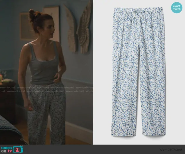 Maddie Townsend (played by JoAnna Garcia Swisher) on Sweet Magnolias on Netflix was spotted wearing this blue floral print pants on Sweet Magnolias on episode 'Hide and Seek' (4x07) in Feb 2025. Maddie's Pants is the Poplin PJ Pants by Gap.