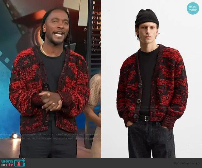 Scott Evans on Access Hollywood on NBC was spotted wearing this abstract knit cardigan on Access Hollywood on Feb 13 2025's episode. Scott's Sweater is the Jacquard Cardigan by Zara.