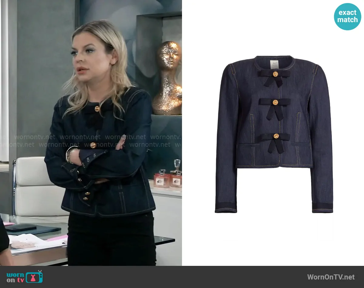 Maxie Jones (played by Kirsten Storms) on General Hospital on ABC was spotted wearing this denim jacket with bows on General Hospital on Feb 14 2025's episode. Maxie's Jacket is the Taya Jacket by Cinq a Sept .