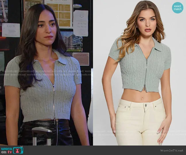 Gabi Hernandez (played by Cherie Jimenez) on Days of our Lives on Peacock was spotted wearing this sage green cable knit zip sweater on Days of our Lives on Feb 18 2025's episode. Gabi's Top is the Two Way Zip Kora Knit Top in malibu sage by Guess.