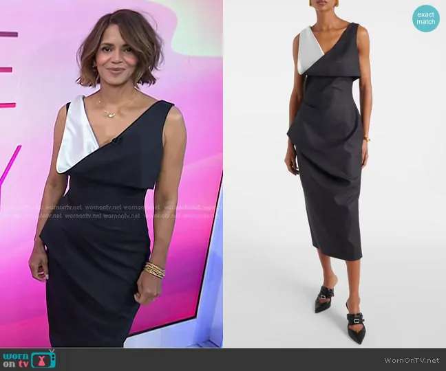 on Today on NBC was spotted wearing this black draped dress on Today on Feb 18 2025's episode. 's Dress is the Pinstripe Draped Wool Midi Dress by Alexander McQueen.