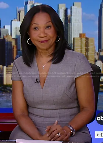 on Good Morning America on ABC was spotted wearing this grey v-neck cap sleeve dress on Good Morning America on Feb 19 2025's episode. 's Dress is the Alber Cap Sleeved Tailored Dress by Reiss.
