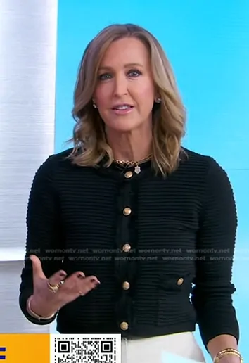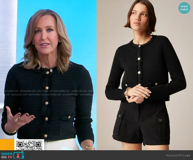 Lara Spencer on Good Morning America on ABC was spotted wearing this black ribbed knit jacket on Good Morning America on Feb 19 2025's episode. Lara's Jacket is the Emilie Sweater Lady Jacket in textured cotton by J. Crew.