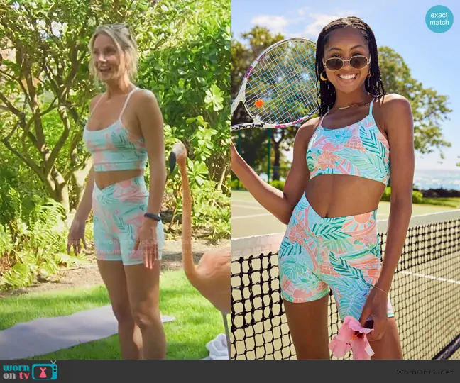 Taylor Ann Green on Southern Charm on Bravo TV was spotted wearing this blue floral print sports bra and biker shorts on Southern Charm on episode 'Text Message in a Bottle' (10x11) in Feb 2025. Taylor's Sports Bra is the The Hawaii Racerback Sport Bra by Kenny Flowers . Taylor's Biker Shorts is the The Hawaii Sport Short by Kenny Flowers.