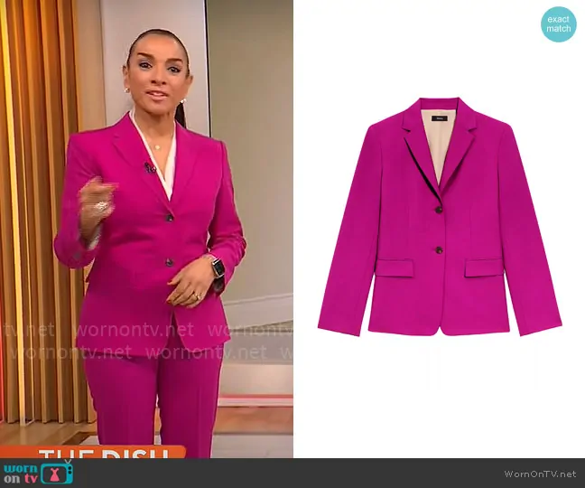 Michelle Miller on CBS Mornings on CBS was spotted wearing this pink suit on CBS Mornings on Feb 23 2025's episode. Michelle's Jacket is the Slim-Fit Wool Blazer in Wildflower by Theory . Michelle's Pants is the Stretch Wool Straight Full-Length Trousers in Wildflower by Theory.