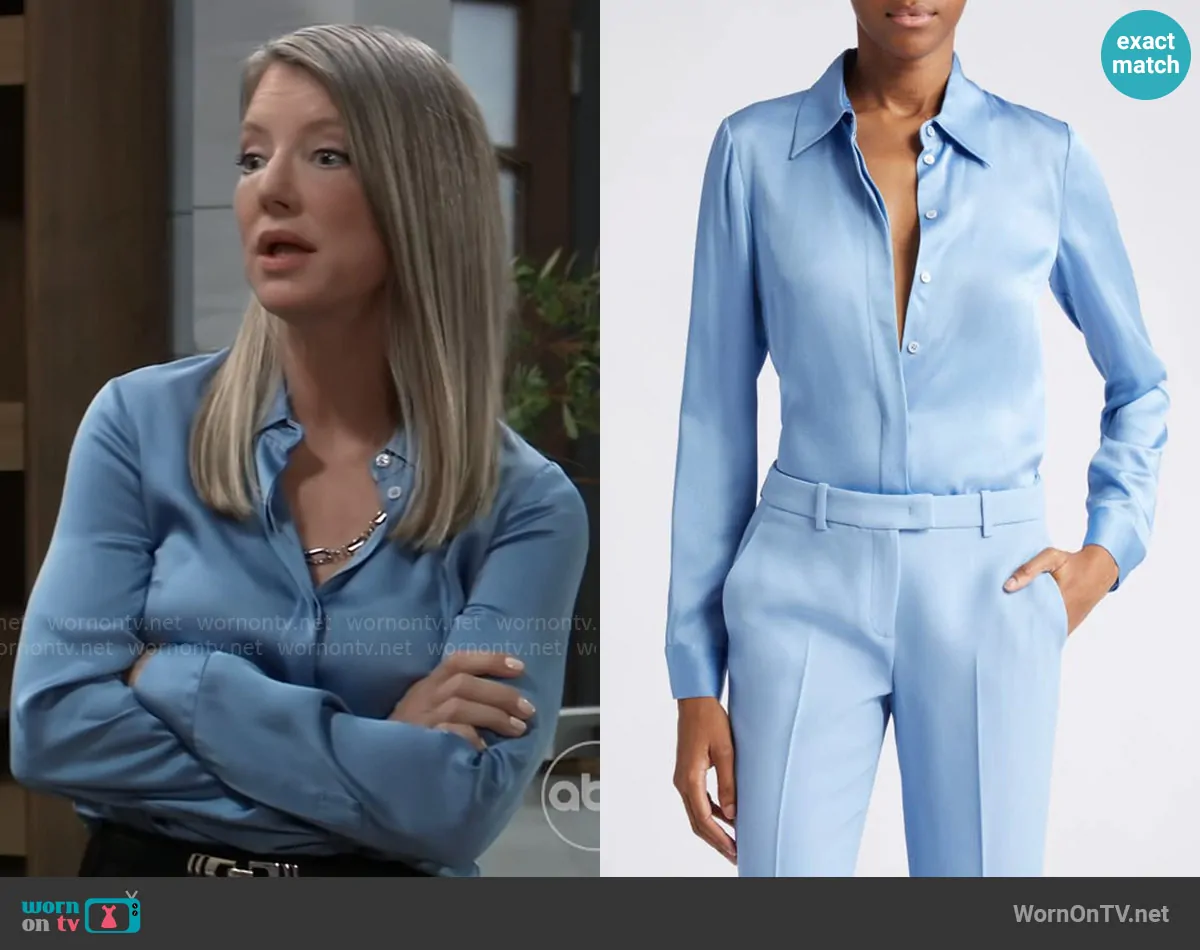 Nina Reeves (played by Cynthia Watros) on General Hospital on ABC was spotted wearing this blue button down blouse on General Hospital on Feb 25 2025's episode. Nina's Top is the Hansen Charmeuse Button-front Shirt in Coast by Michael Kors .