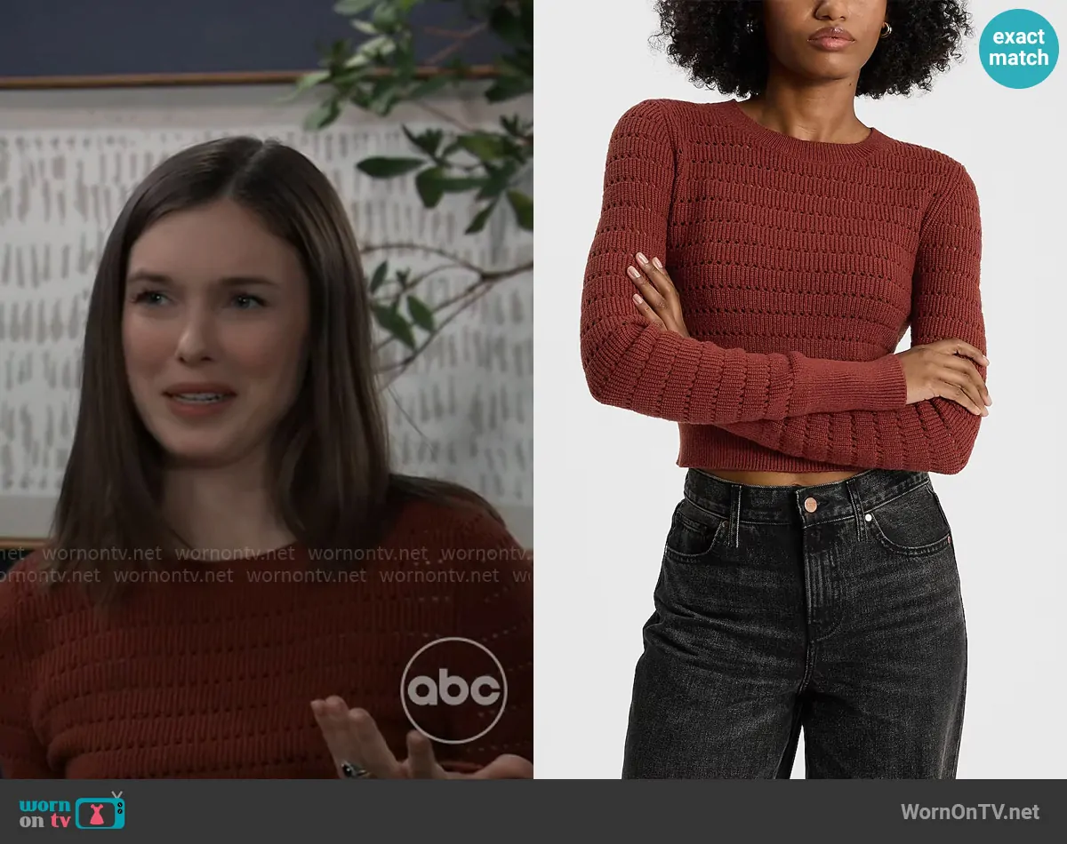 Willow Tait (played by Katelyn MacMullen) on General Hospital on ABC was spotted wearing this dark red sweater and wide leg jeans on General Hospital on Nov 20 2025's episode. Willow's Sweater is the Open Stitch Crew Neck Cropped Sweater in Fired Brick by Express .