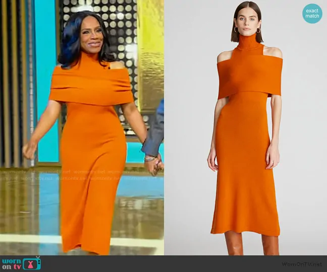 on Tamron Hall Show on ABC was spotted wearing this orange cold shoulder dress on Tamron Hall Show on Feb 26 2025's episode. 's Dress is the Ensley Dress in Wool and Cashmere by Halston.